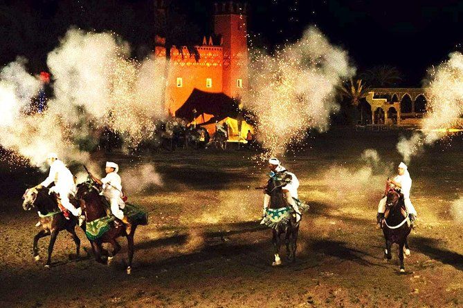 Upon arrival, you will be greeted by Berber tribes and led to your seats in a caidal tent. Then as you feast on a 5-course meal, you will watch musical and dance performances, daring horse-back-stunts, fireworks, death-defying acrobats, and exotic belly dancers. Various troops from Moroccan history will pass by your table as you eat, including the Zayane, Kelaa M’Gouna, and Guedra.
